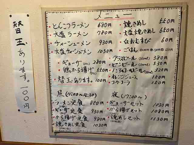 メニューはこちら。ラーメンはもちろん豚骨一本、そして替玉。焼飯、餃子、唐揚げと定番的なサイドメニューも揃います。
