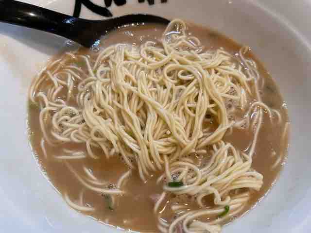 博多の豚骨ラーメンといばこの細麺、茹で加減はリクエストせずに注文したので、程よい柔らかさです。