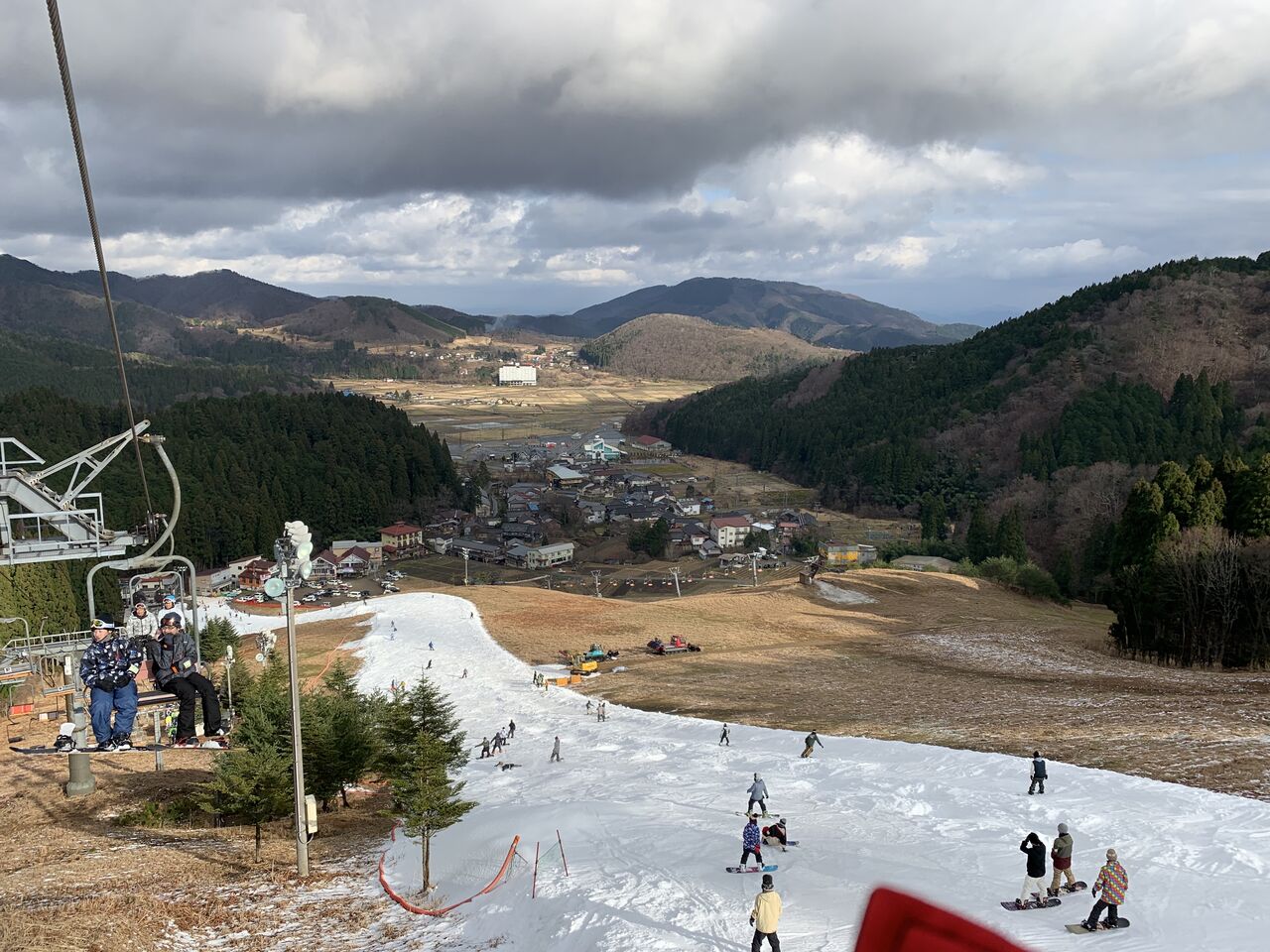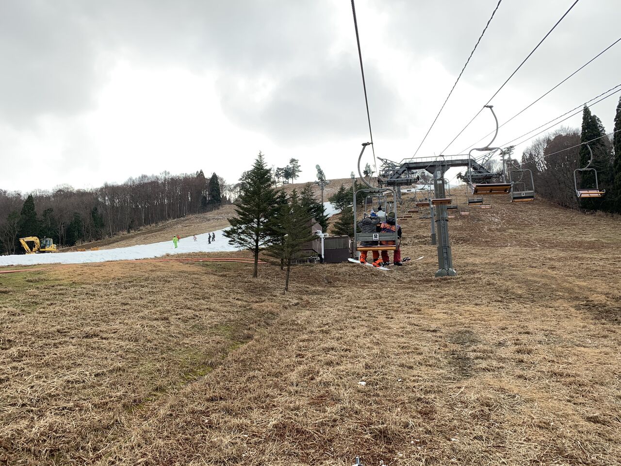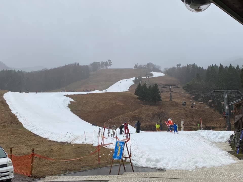 人工雪でかろうじて1コースをカバーしている状態で、ゲレンデの全体景色としては悲しい状況であったが、コース上は、リフト降り場〜乗り場まで普通に滑走することができる。土が出ているところもほとんど無く、人工降雪機でここまで整備できるという点では、他のゲレンデが全く雪がない状態に対して、かなりの評価に値する。ここまで来て滑りに来た甲斐があったというものだ。