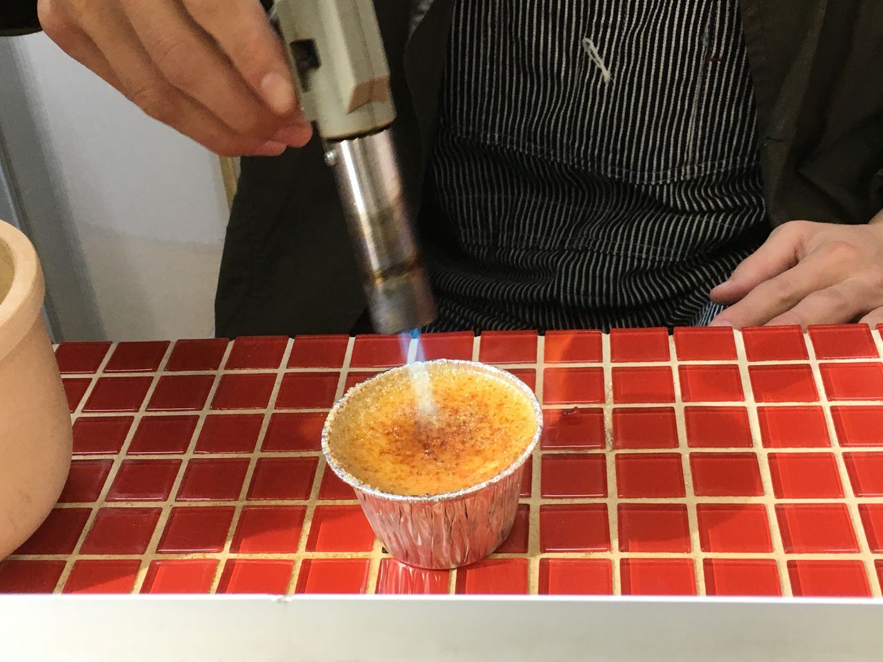 注文すると、その場でバーナーでキャラメリゼしてくれ、カラメルの香ばしいいい香りが漂い、完成。出来上がりを袋に入れて渡してくれた。