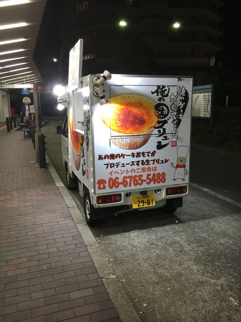昨晩、宝塚南口に見慣れない軽トラックを発見。近づくと、ブリュレの販売をしている模様。「俺のケーキ おもて プロデユース 俺の生ブリュレ!」とある。宝塚南口駅で電車を降りてぞろぞろと家路へと向かう人達のうち、ちらほらと購入している姿が見える。