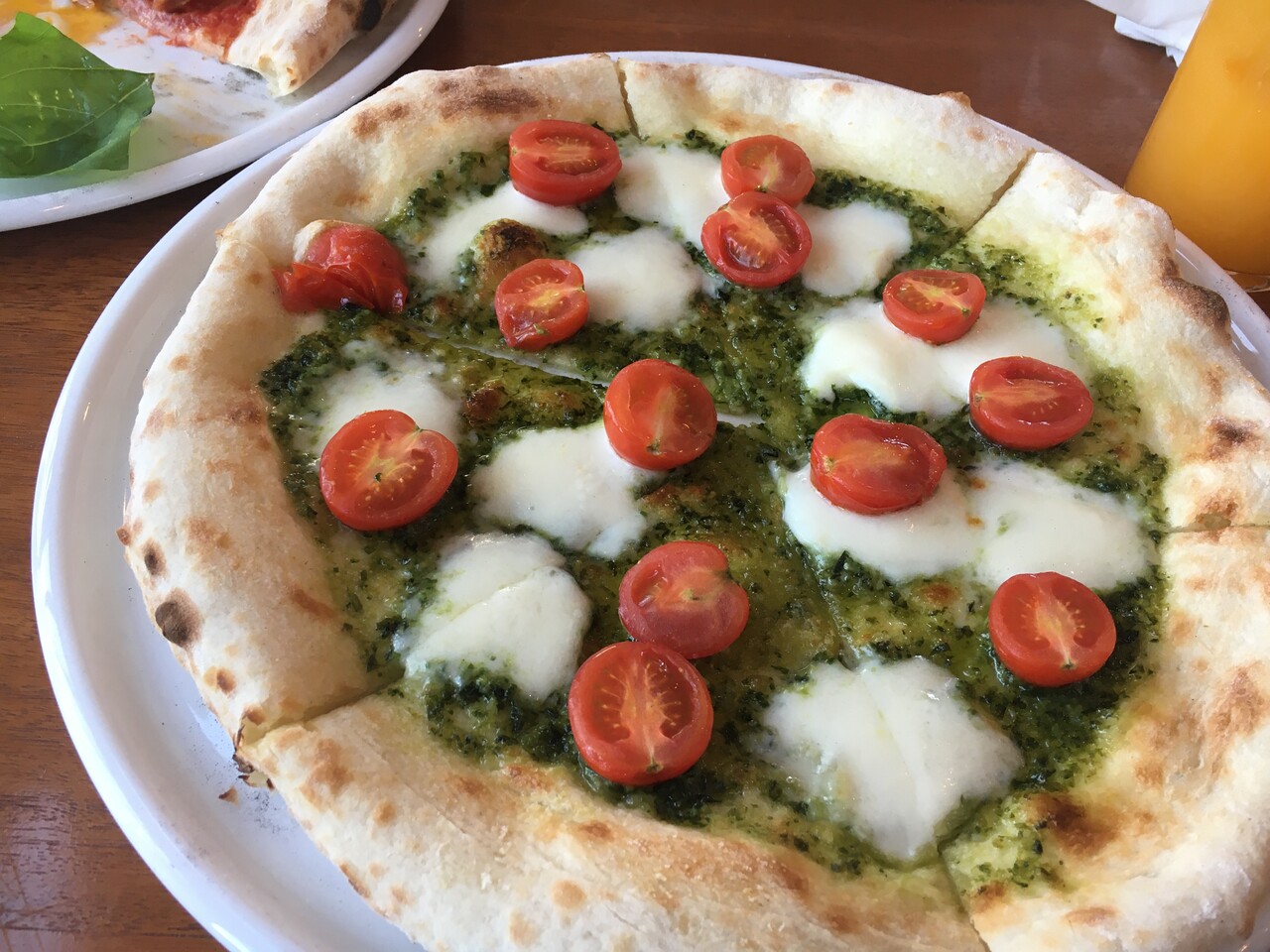 バジルソースとモッツァレラチーズが贅沢に載っています。ピザは高温の薪窯で焼き上げられており耳までおいしい!