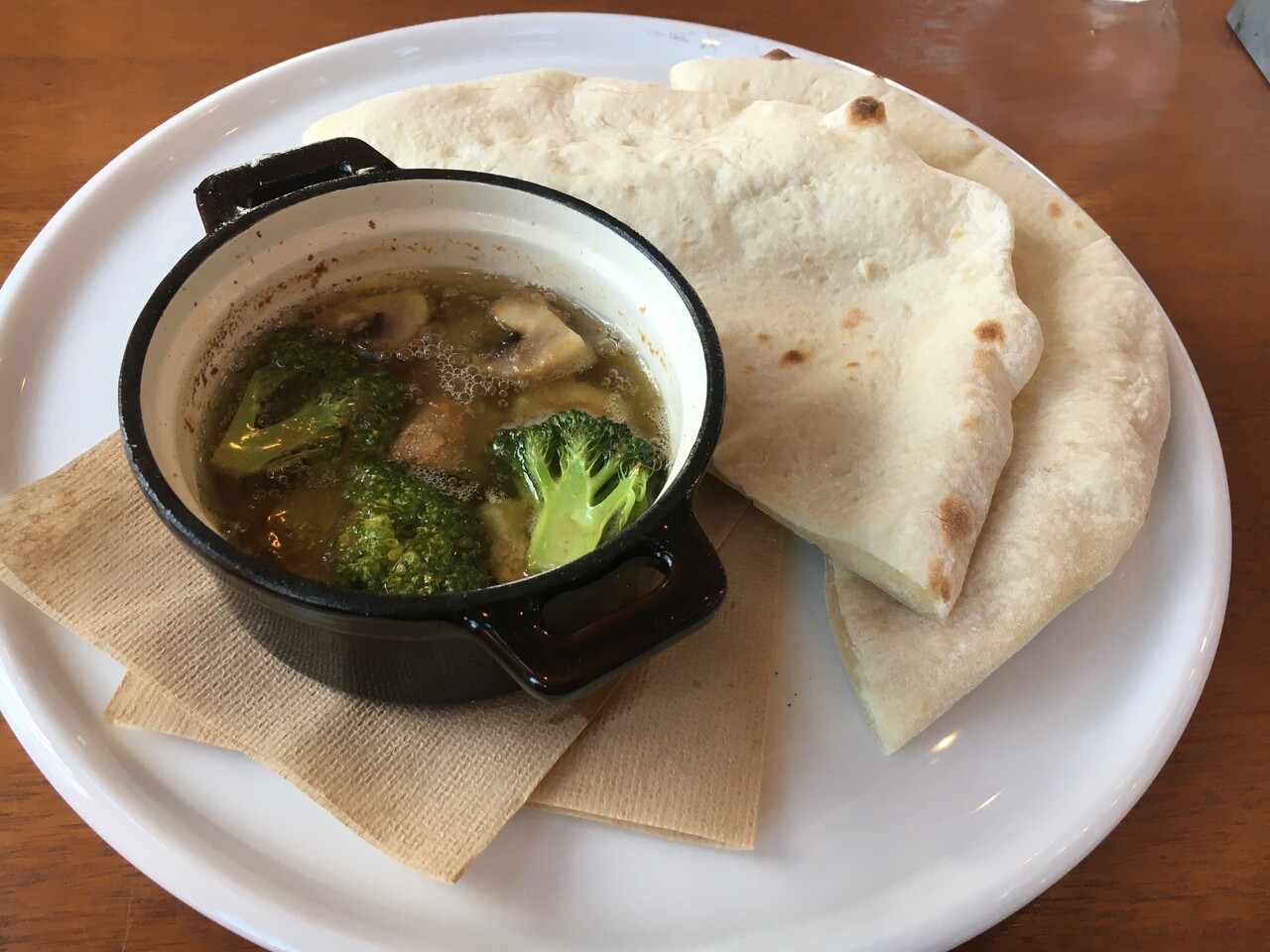 ブロッコリーとマッシュルーム・えびが入ったアヒージョには、ピザパンが付いています。こちらも、ピザ同様焼きたてのもちもち!