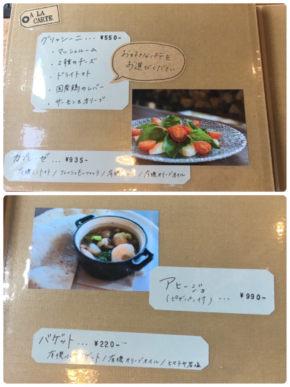 この日は、生ハムとたまごのトマトソース、ミニトマトとチーズのバジルソースをランチセットで。単品でアヒージョを注文しました。