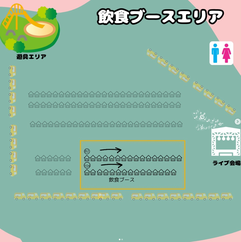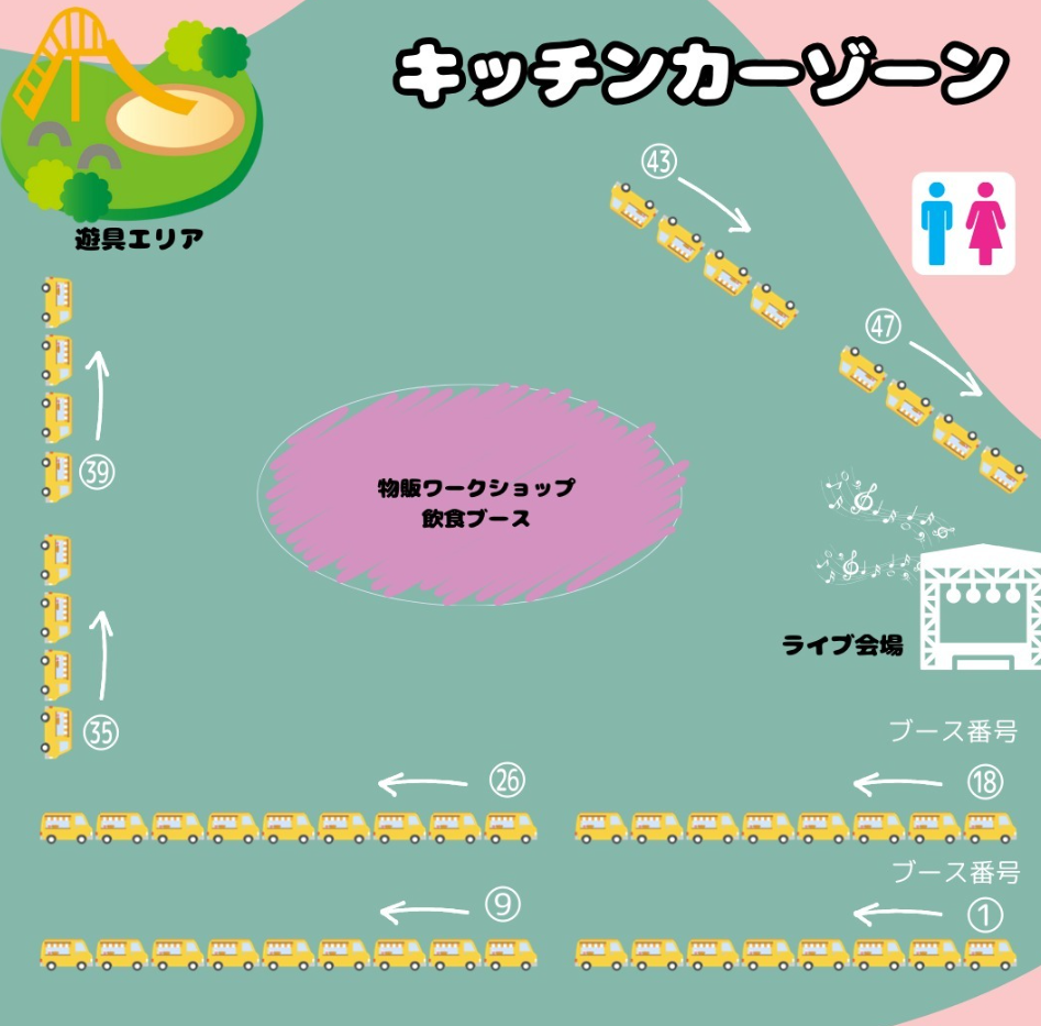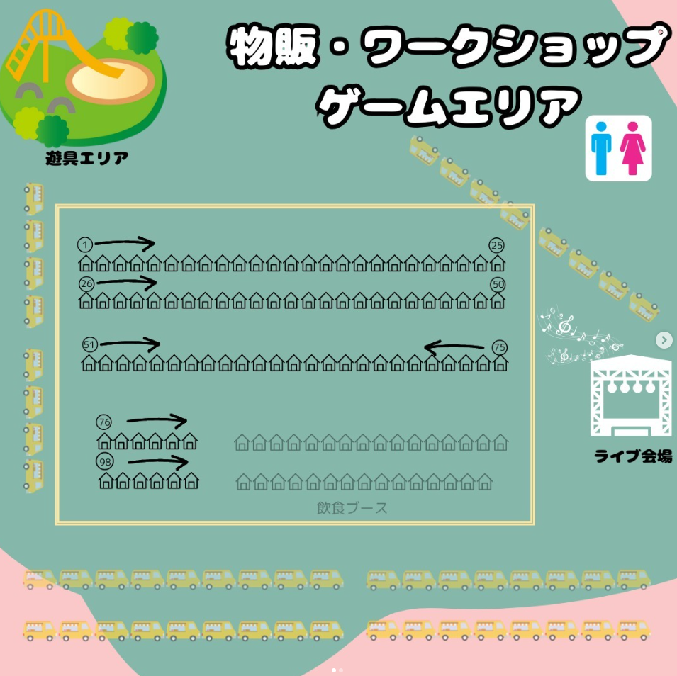 キッチンカーゾーン、物販・ワークショップ・ゲームエリア、飲食ブースに分かれています。