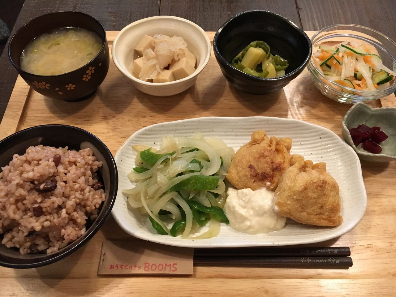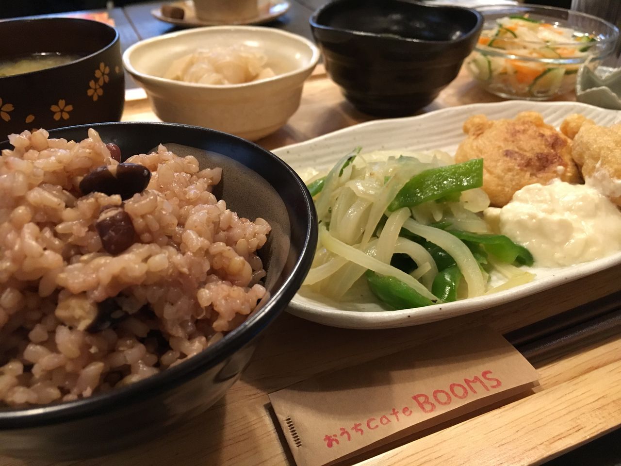 手前に見える玄米ごはんは、おうちcafeBOOMSならではの玄米酵素ごはん。柔らかい食感でつくるには、3日間寝かせる必要があるところ、ミネラルたっぷりの水をつかう事で炊きたてで柔らかい玄米ご飯を実現している。