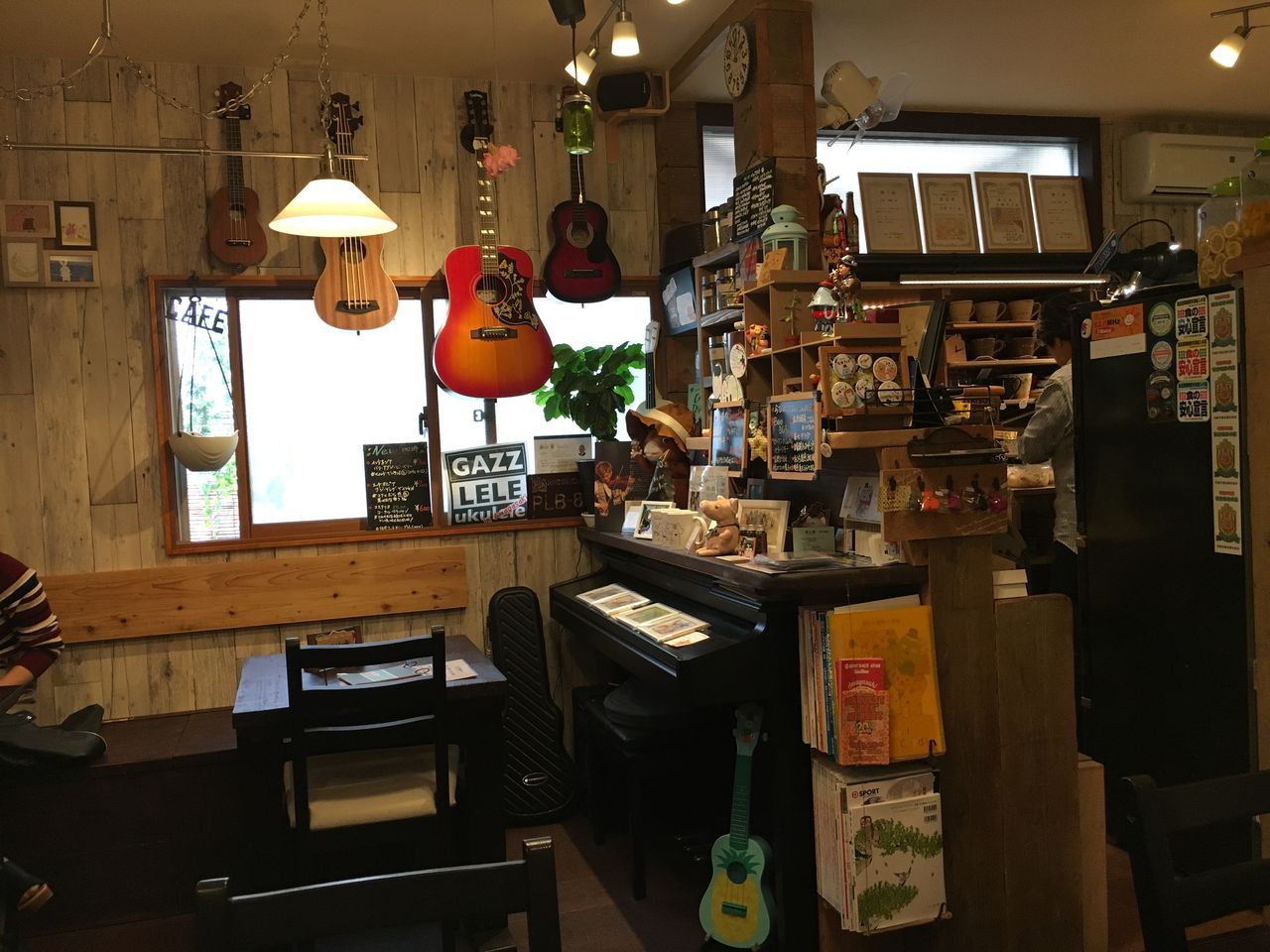 ウクレレ、ギター、友人のグッズ等、雑貨ががたくさん並ぶ内装は、いろいろ飾ってあり温かみあふれる、落ち着く空間。ウクレレとの出会いも、「音楽で免疫力を高めよう」という考え方のGAZZ LELE(ガズレレ) (Makoto “GAZZ” Kubota ガズ)と自分達の「食事で免疫力を高めよう」と同じ道だと意気が合い、GAZZ LELE(ガズレレ) の「勝手にガズレレ」の取り組みに参画し、月一回の練習会を開催している。行動力のある石田さんならではだろう。