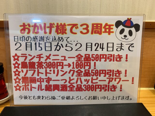 阪急逆瀬川駅から徒歩3分ほど、アピア2の1階にある「宝塚中華 ぱんだ楼」では、2020年の2月17日オープン(当時の記事参照)から、3周年を迎えるにあたり、2/15〜2/24までの10日間の期間で、割引価格での提供が始まります。
