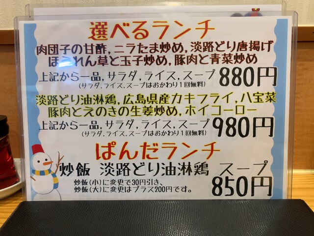 ランチメニューの中で、私が行く時に注文の声をよく聴くのは「ぱんだランチ!(850円)」です。これは、チャーハン・油淋鶏(ユーリンチー)・たまごスープのセットで、おそらく人気のメニューと思われます。