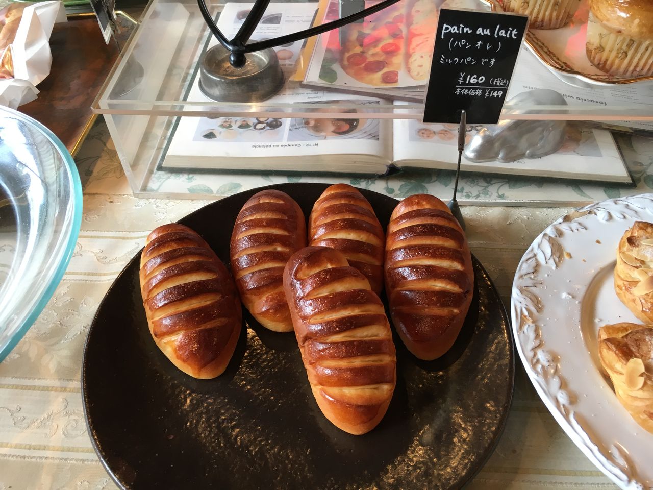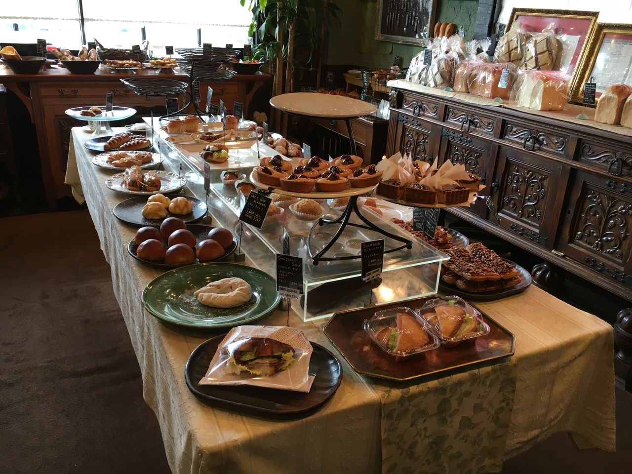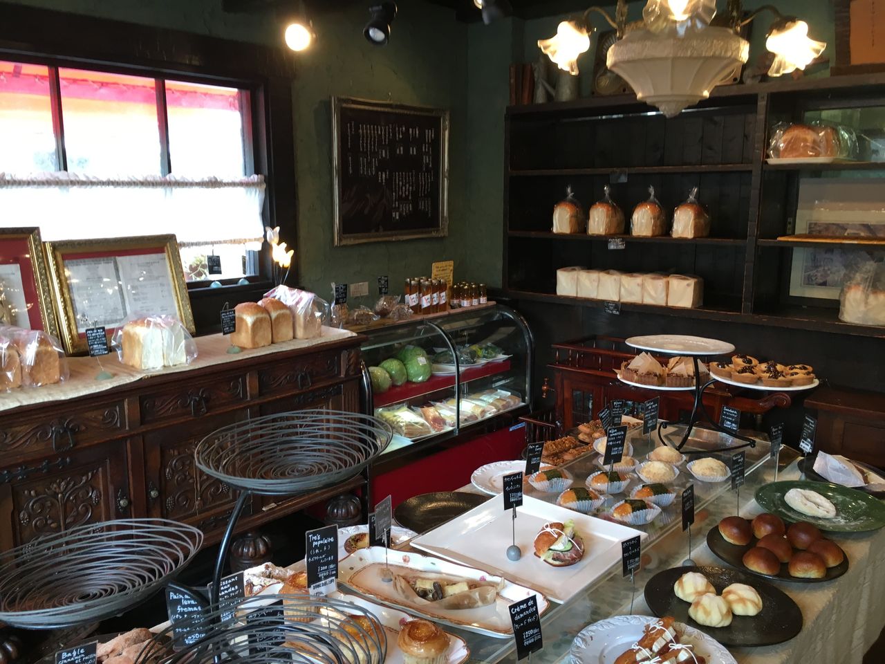 中に入ると、パン職人のオーナーらしき方がパンを焼いています。店内は、ヨーロッパ調の家具、落ち着いた色目、おしゃれな雰囲気の中パンが並んでいます。
