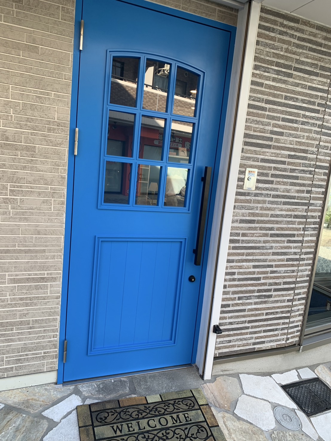 ぱっと目を引く青い色のドアがとても印象的で、外から見てもかわいらしい雰囲気が伝わってきます。