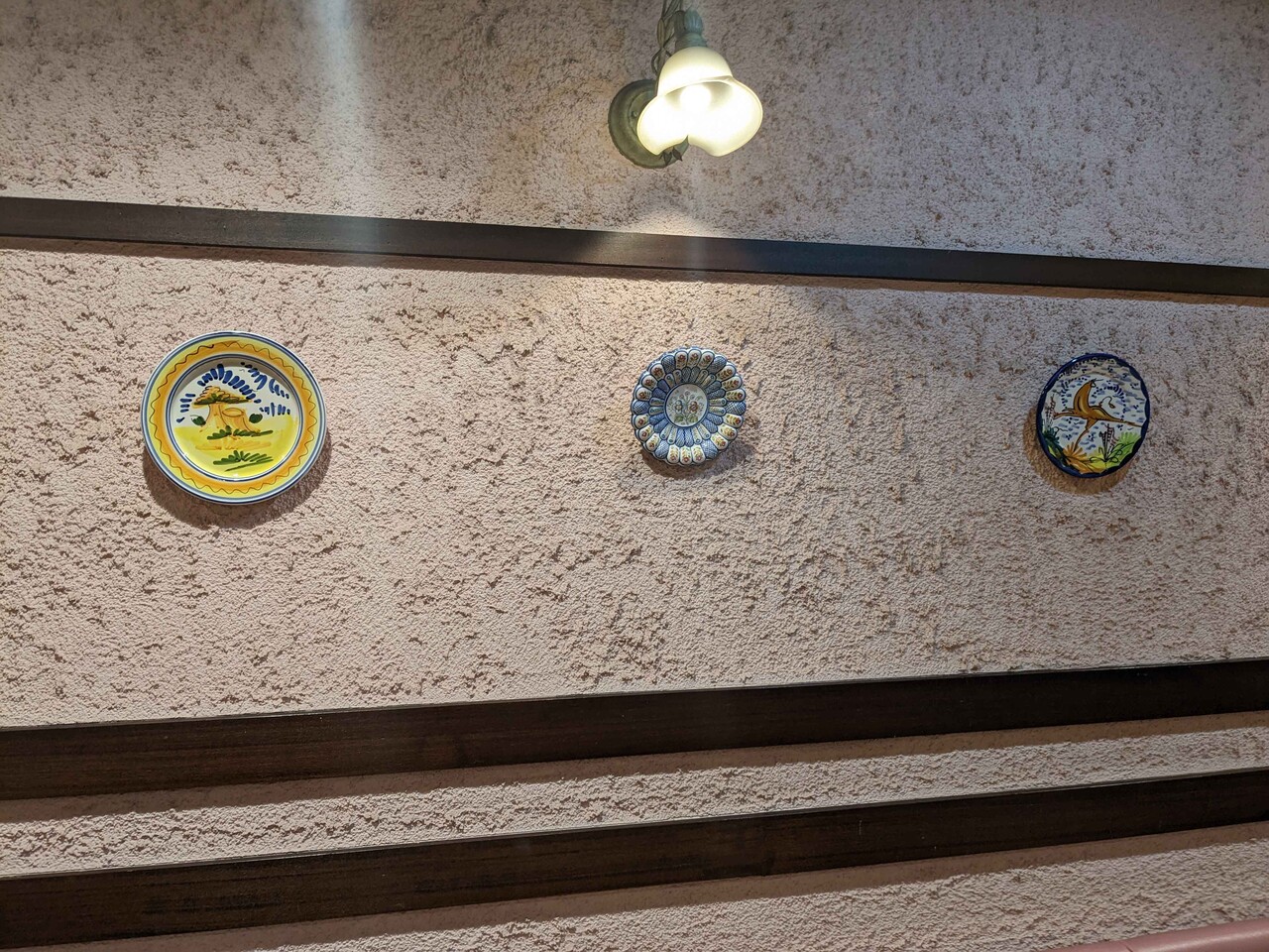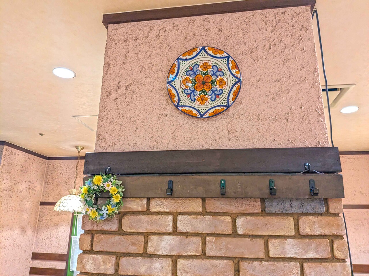 レンガを使用した壁には、お花や絵皿が飾られていて、照明が絵皿のスポットライトにもなっています。