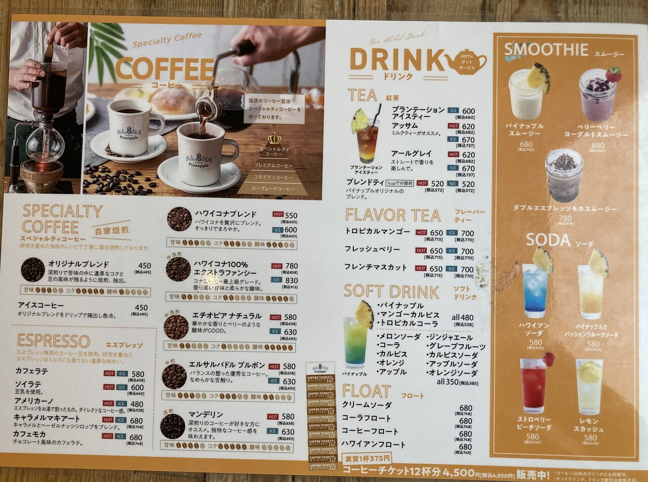 ハワイのコナコーヒーや、見た目もきれいなトロピカルドリンクなど、ドリンクの種類がとても豊富です。