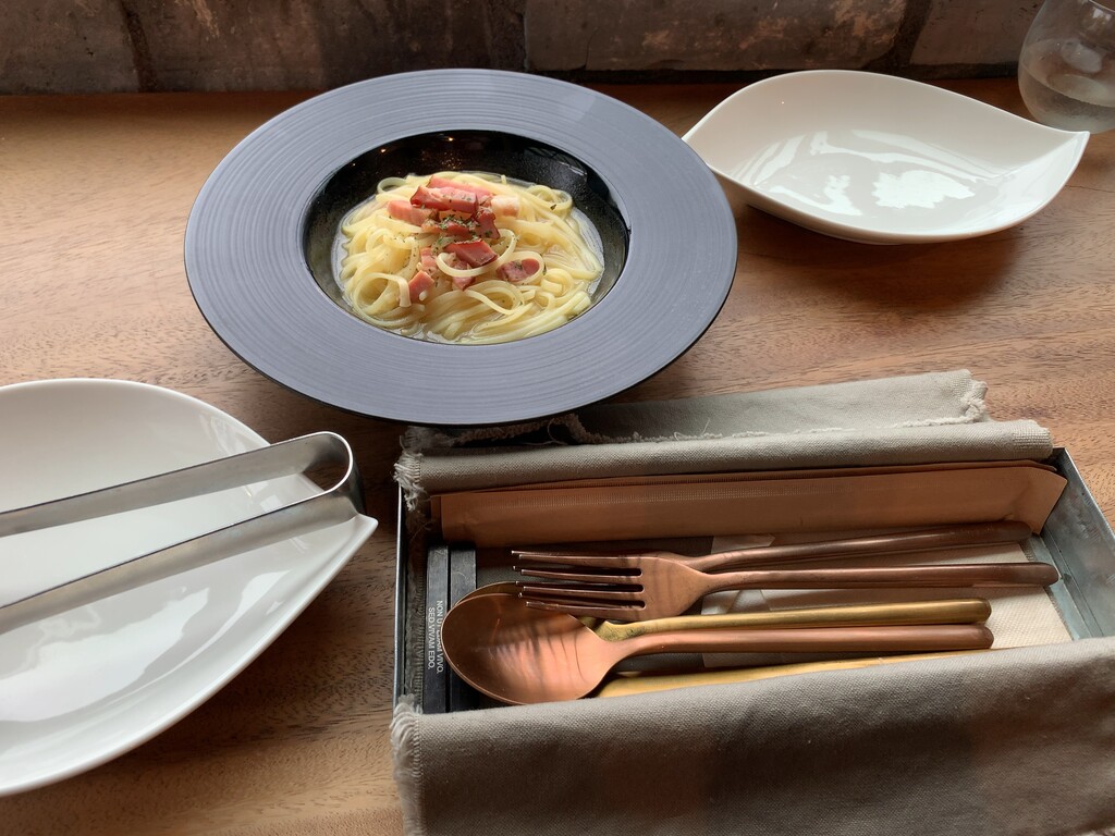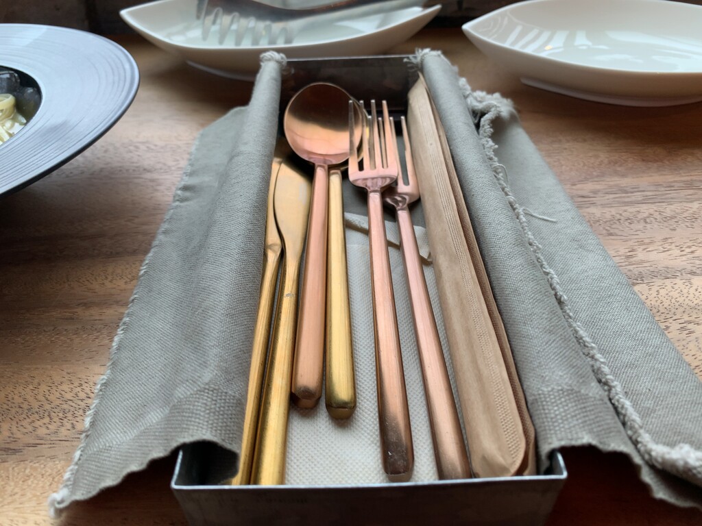 プレートは葉の形をしていて森の中らしく、カトラリーはブロンズとゴールドのカラーリングで、