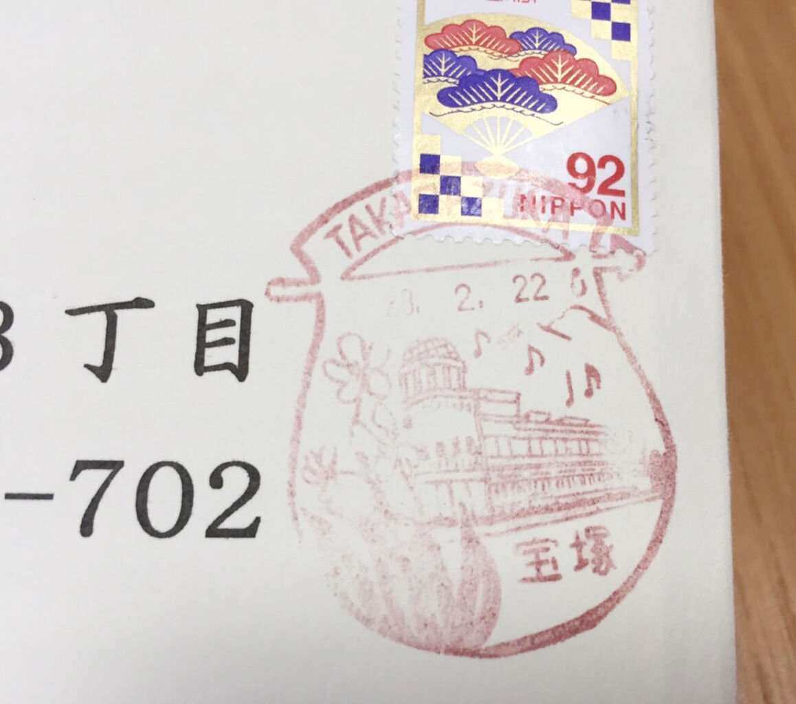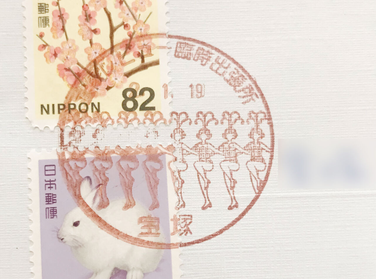 丸い形の消印が基本的ですが、宝塚のように変形バージョンもあります。