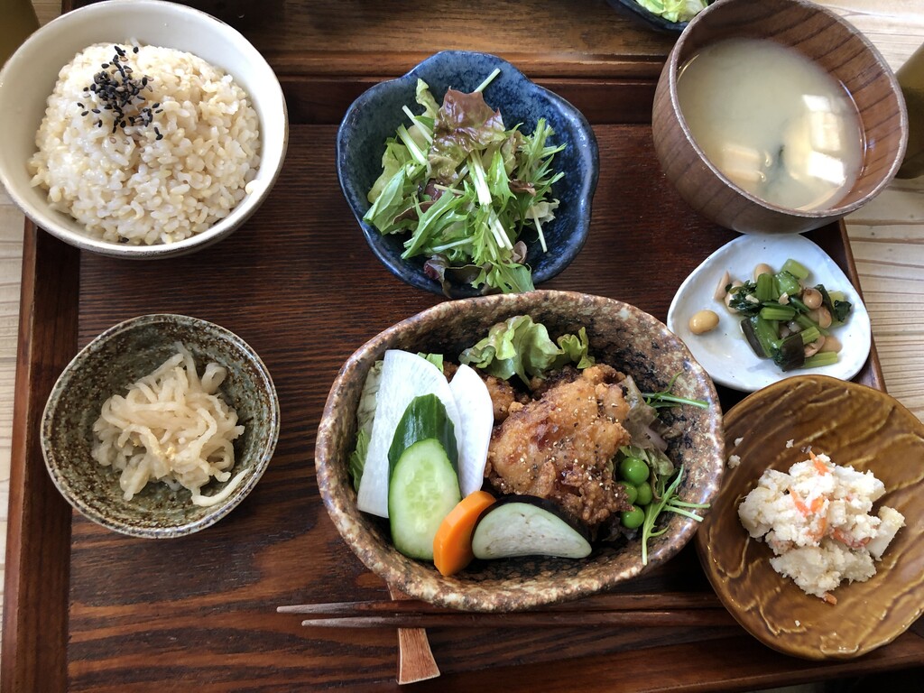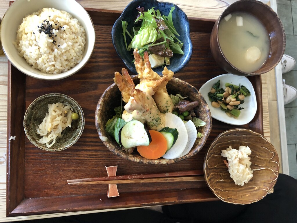 おぼんごはんは、15種類あり終日注文可能。全てに、特別栽培米の玄米ごはん・日替わり小鉢3品・お味噌汁・有機野菜サラダがつくのでバランスよく食事できるのがうれしいですね。