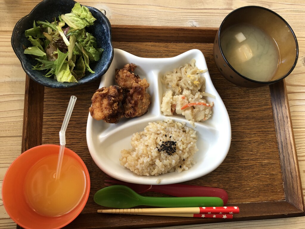 お値段は500円と、お手頃ですが一般的なキッズプレートと違い、お野菜もしっかりと食べられます。メインは塩麹からあげかミートボールか選べ、からあげを選びました。