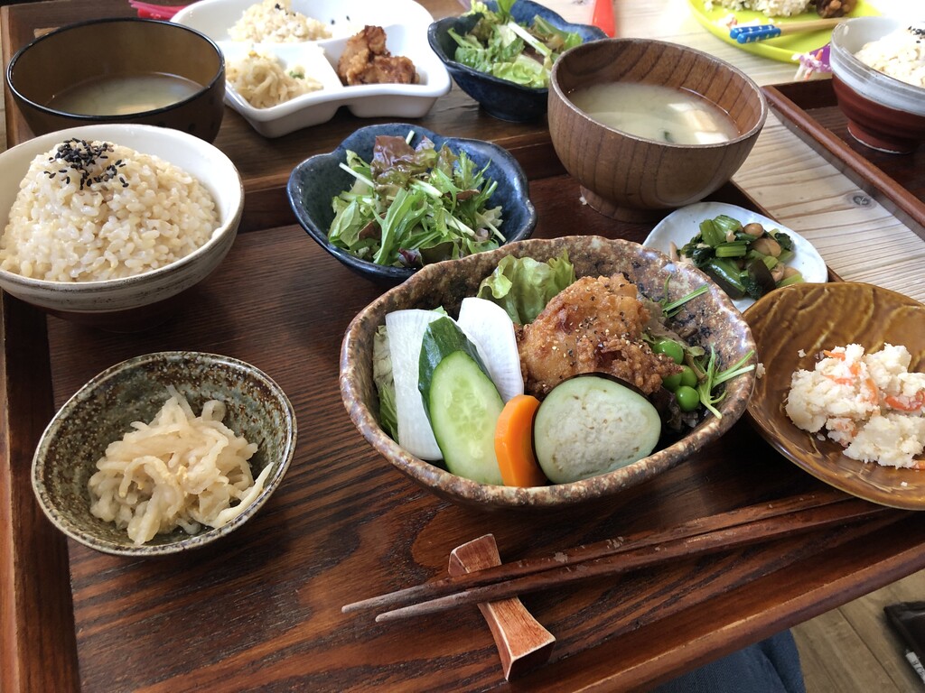 ランチは、「オリーブオイルで揚げたやわらか鶏もも塩麹からあげ」、「海老マヨと有機野菜のオリエンタル風」と「オーガニックお子様プレート」を注文。