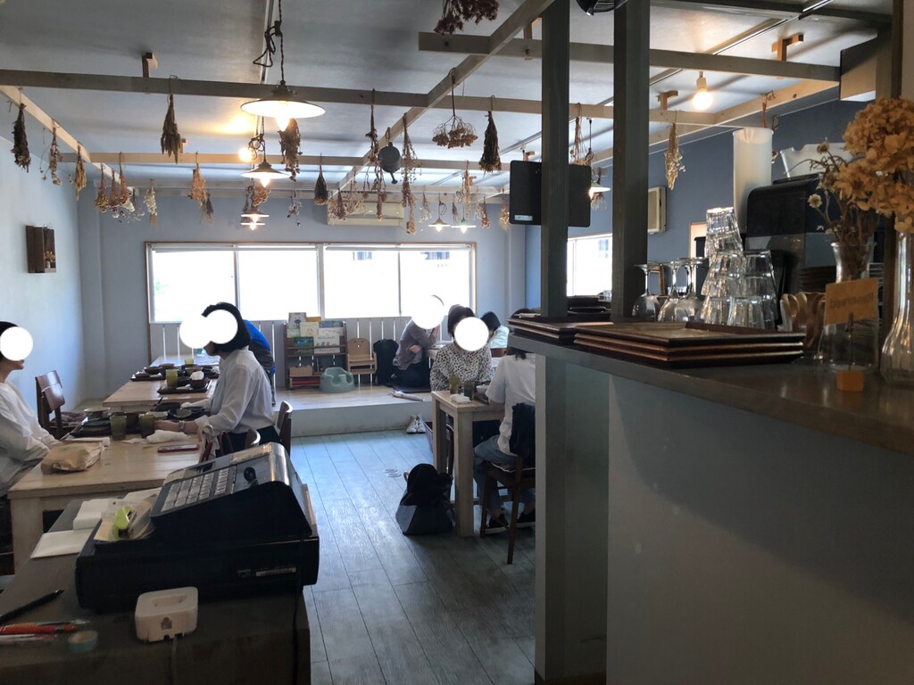 上からドライフラワーが飾られ、ナチュラルでおしゃれな店内には、テーブル席と子連れにうれしい小上がりの席があります。