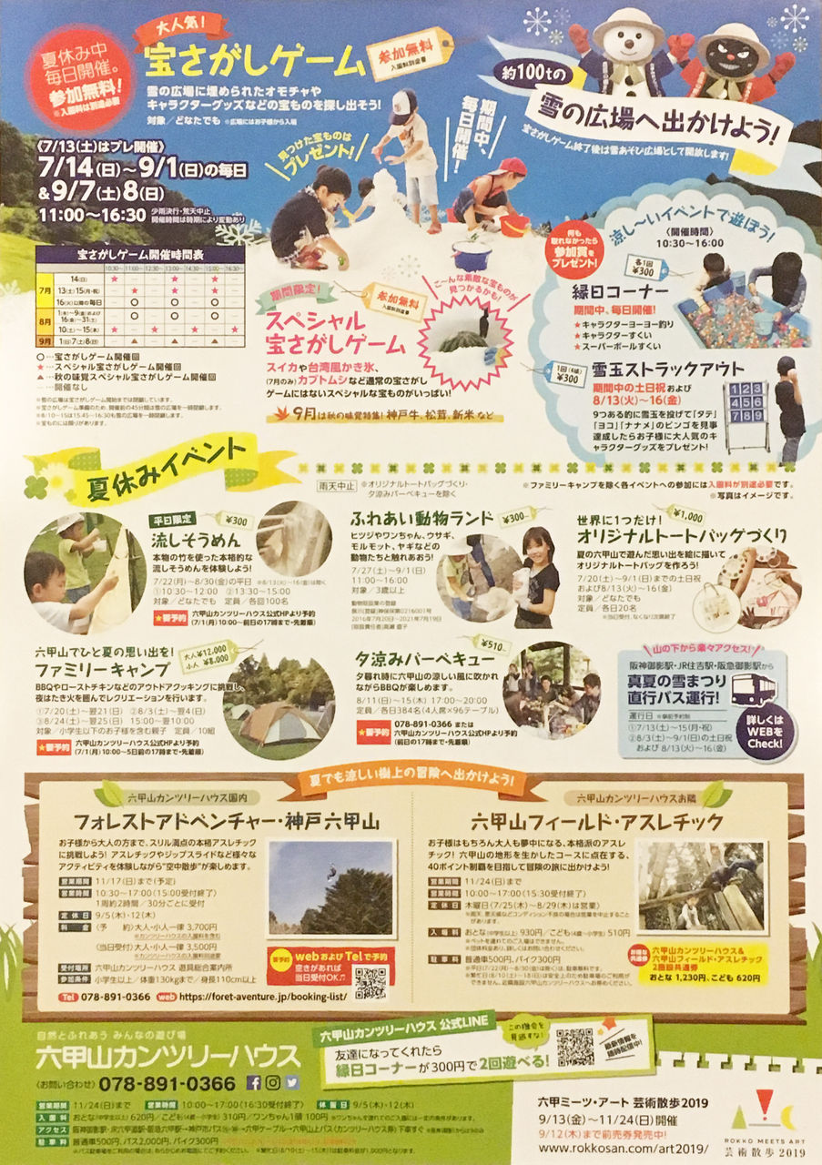 さらに、六甲山カンツリーハウスでは、2019年春にオープンしたばかりのフォレストアドベンチャー(https://fa-koberokkosan.foret-aventure.jp/)や、フィールドアスレチック(https://www.rokkosan.com/athletic/)などもあり遊び場が満載。8/24土 には、Kiss FM KOBE Day(https://www.rokkosan.com/country/event/cat_event/3927/)等、その他イベント企画が設定されている日もあり、楽しみが盛りだくさん。平日限定の「流しそうめん」や、雪の広場に埋められた ”宝もの” を探し出す「宝さがしゲーム」などなど。