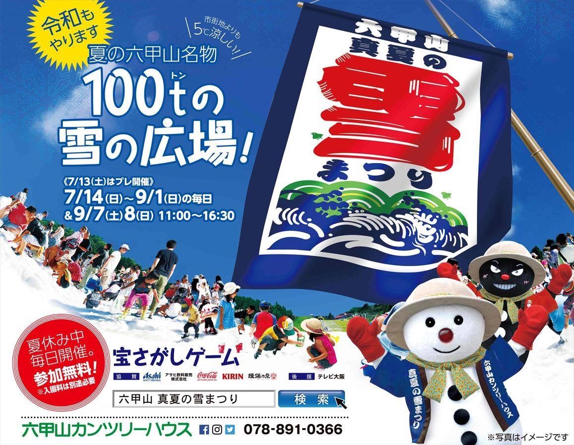 真夏の雪まつりが六甲山カンツリーハウスで行われている(7/14 〜 9/1)。まだまだ暑い日々が続きそうな夏休みモードのファミリーにとっては、100tの雪の広場の「真夏の雪まつり」で涼ししい気分を味わえるはずだ。