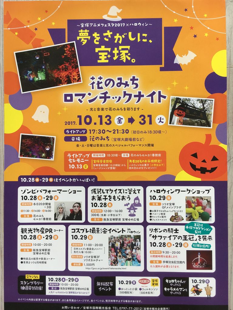 宝塚アニメフェスタ2017がハロウィンとコラボしたイベントを、10/28(土) 29(日)に開催する。そのイベントに合わせて、阪急宝塚駅から宝塚大劇場を結ぶ「花の道」では、10月13日(金曜日)から31日(火曜日)までの間、「夢の世界へ続くみち」をコンセプトに「花のみち ロマンチックナイト」として、光と音楽で周辺が彩られます。