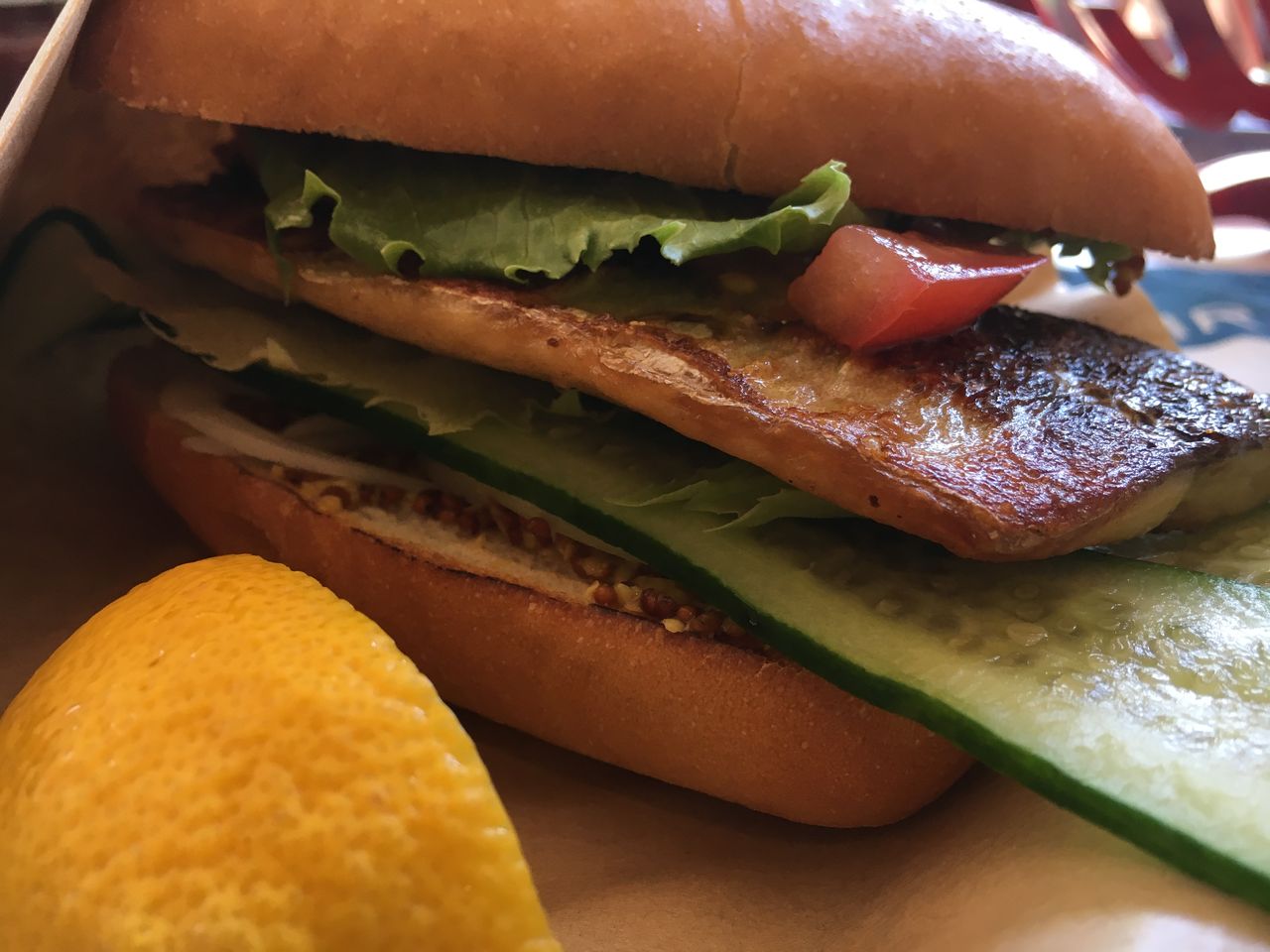 「レモンをしっかり絞って食べてくださいね!」といつも元気なお店のお姉さん。心の中で「魚のソテーとホットドッグか…。」と未知の味にいろいろな事を想像しながら、きゅうりを少し短くなるまでかじり、ホットドッグ本体をバクっと、食べてみた。「美味!」。魚の臭みも骨もなく、レモンが爽やか感を作り出していて、ホットドッグとしてもマルという驚きの組み合わせ。