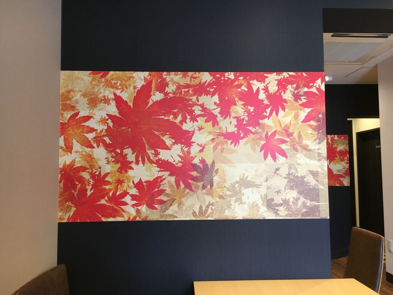 店内写真。もみじ柄の店内壁紙はギャラリーの様で、そして風情がある。