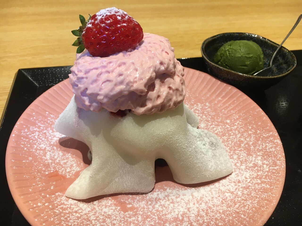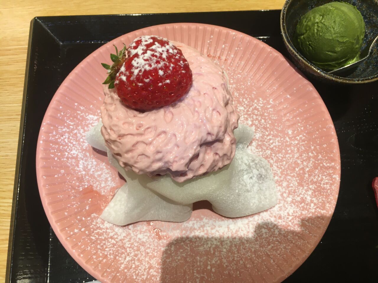 ごろっとまるごと乗った苺の下には、ピンク色が可愛いふわっふわの甘酸っぱい苺エスプーマ。もちもち求肥の下には、自家製つぶあんとバニラアイスクリーム、苺が入っています。