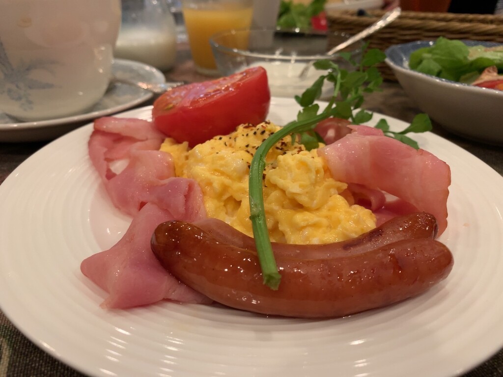 そしてさらに、ベーコン・ソーセージ・スクランブルエッグ・ベークドトマトがのったモーニングプレートが。