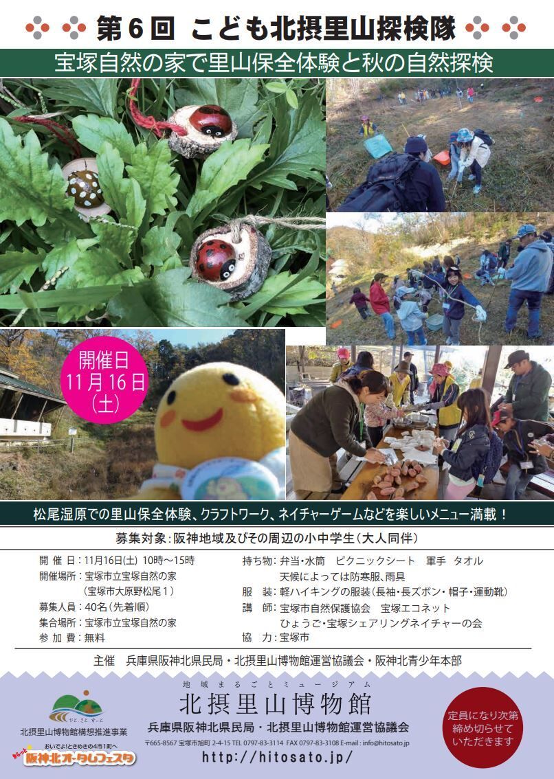 11月16日、宝塚市立宝塚自然の家で第6回こども北摂里山探検隊『宝塚自然の家で里山保全体験と秋の自然探検』が開催される。参加するには、申し込みが必要。