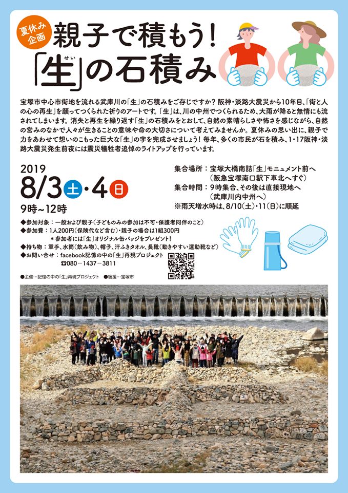 宝塚市街地内を流れる武庫川の中洲にある「生」の石積みオブジェ。阪神・淡路大震災から10年目に「街と人と心の再生」を願ってつくられた祈りのアート。「生」は川の中洲でつくられるため、大雨が降ると無情にも流され消失してしまう。そして、また新しく「生」を制作する。消失と再生を繰り返す「生」の石積みをとおして、自然の素晴らしさや自然災害の怖さを感じ、自然の営みのなかで人々が生きることの意味や命の大切さを考えるイベントなのだそうだ。