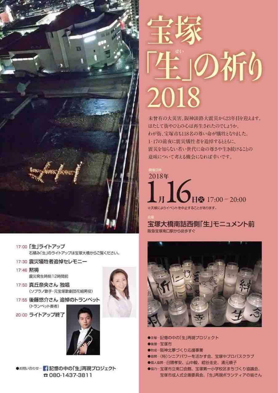 17時から”「生」の石積みオブジェ”(武庫川河川内(宝塚観光ダム直下中洲))と「生」金属製モニュメント(宝塚大橋南詰西側)がキャンドルの灯りによってライトアップされ、黙祷が行われる。また、真丘奈央さん(元宝塚歌劇団花組男役)による独唱や後籐悠介さんによるトランペット演奏を実施される。震災犠牲者を追悼するとともに、震災を知らない若い世代に向け命の大切さを考える機会になって欲しいという想いで催される。