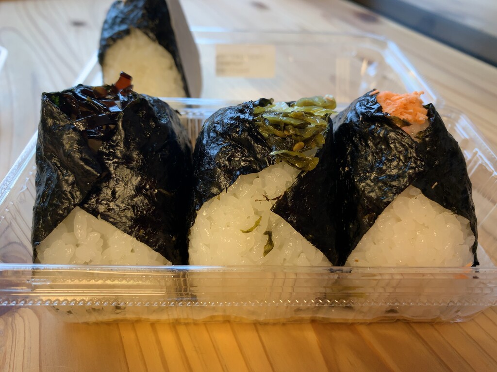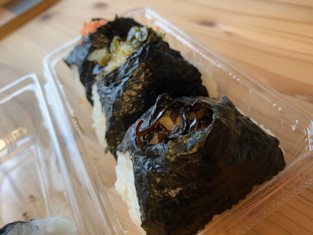 早速注文をしようと思い、「 “鮭” 、”ツナマヨ”…..それと…..ん? オススメは何でしょうか?」と私が尋ねると、店主は「うちの人気ナンバーワンツーは、”ピリカラ高菜” と “ツナマヨ” です。スリーが “しそ昆布” ですかね…」との回答があり、自分的には3つ買うつもりだったので、「じゃあ、”ピリカラ高菜” と “ツナマヨ” と “しそ昆布” をください」と言った直後、脳内で(やっぱり “鮭” も欲しいなぁ)と心の声が響いたので、「やっぱり “鮭” もください! 4つともで!」…。 食べきれるだろうか…という不安にかられながらも、4つのおにぎりを購入。