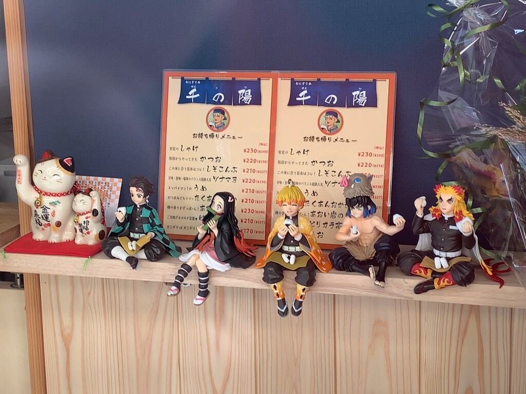 店内の注文口横に鬼殺隊がおにぎりを頬張るフィギュアがあり、食欲をそそります。