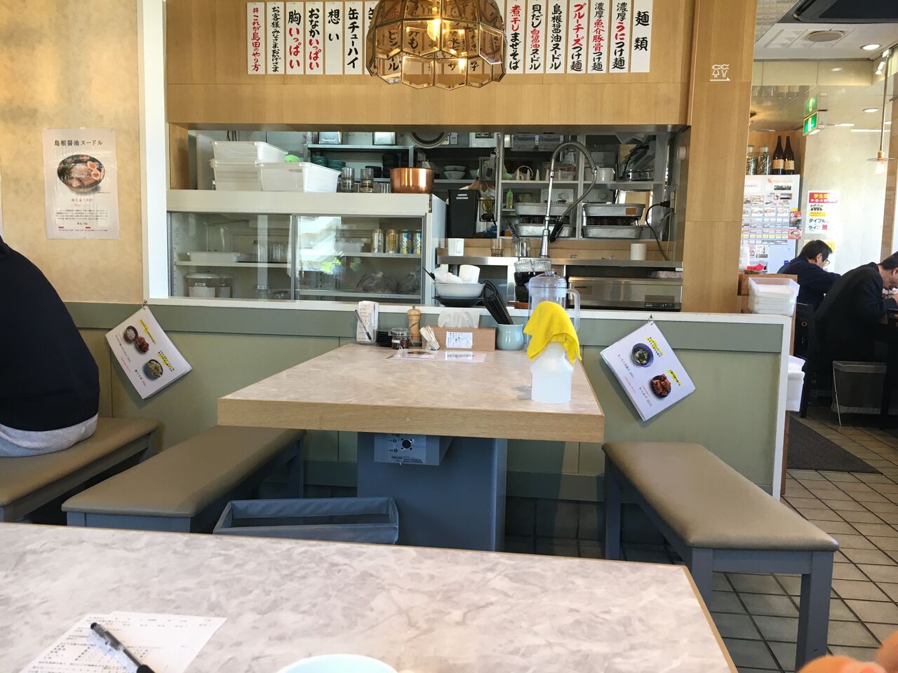 店内は、カウンター6席とテーブル席が5席。ランチタイムだったからか、店内は子連れのファミリー客が多かったです。ラーメン屋さんは、カウンター席が多く、子連れでは行きにくいイメージでしたが、島田製麺食堂さんでは、キッズチェアや取り皿、紙エプロンなどの用意があり、おもちゃももらえるので、子ども連れにやさしいサービスが充実していました。