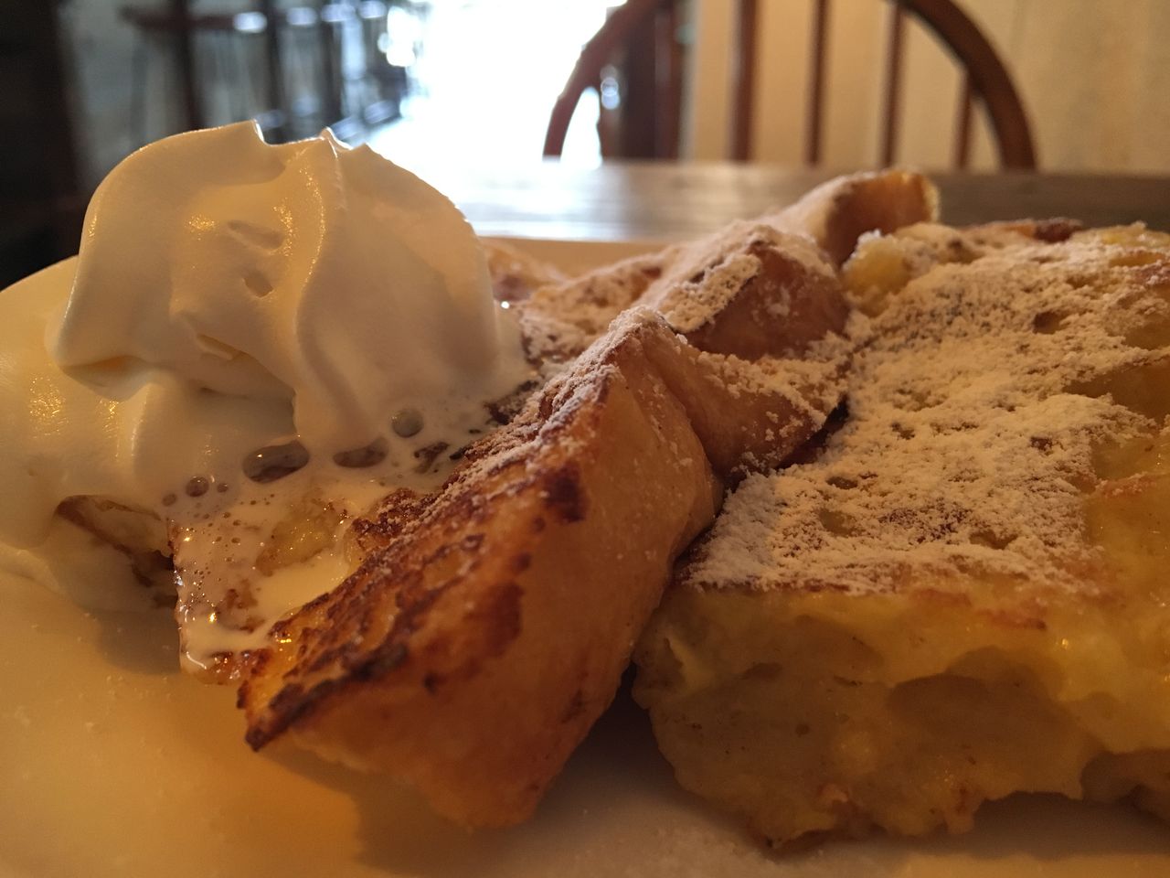 注文したとき、勝手に大きめの丸いパンを切ったフレンチトーストをイメージしていたが、フランスパンの細長いバケットを使ったのフレンチトーストが出てきた。24時間アパレイユに浸して作っているので、1日20食の限定のようだ。