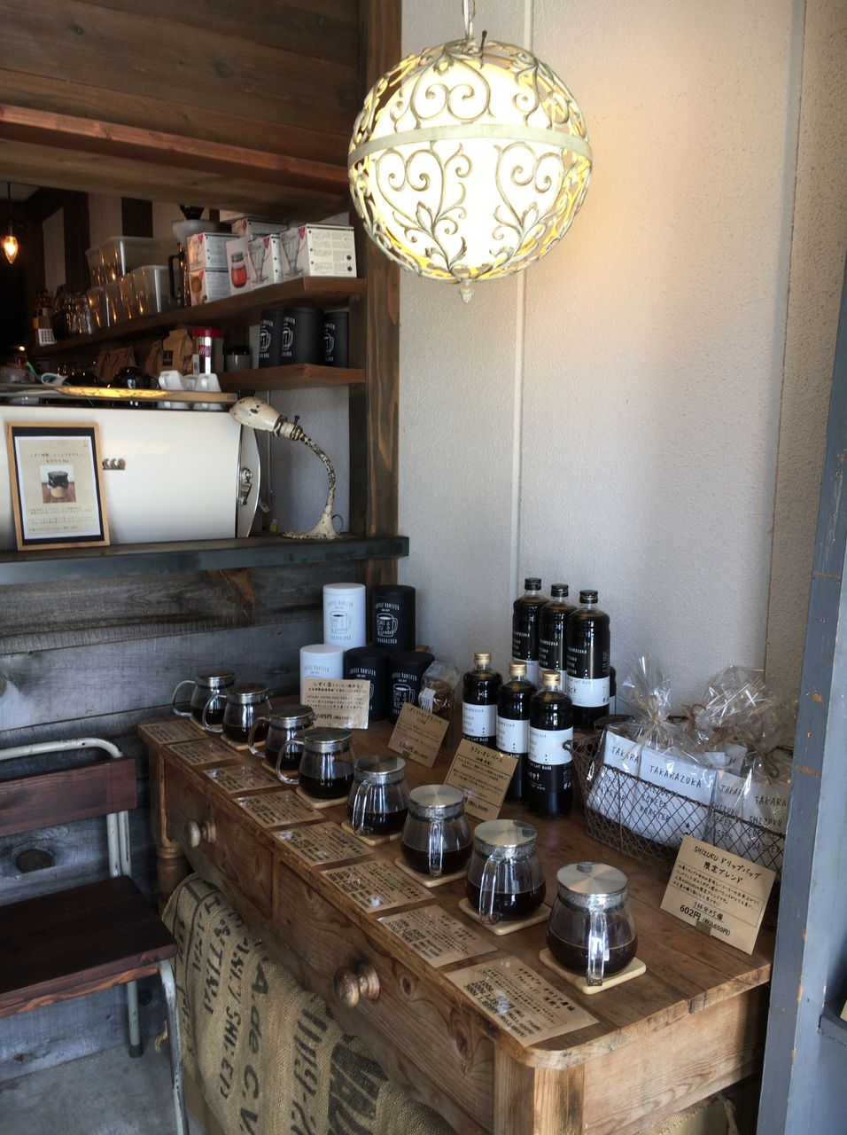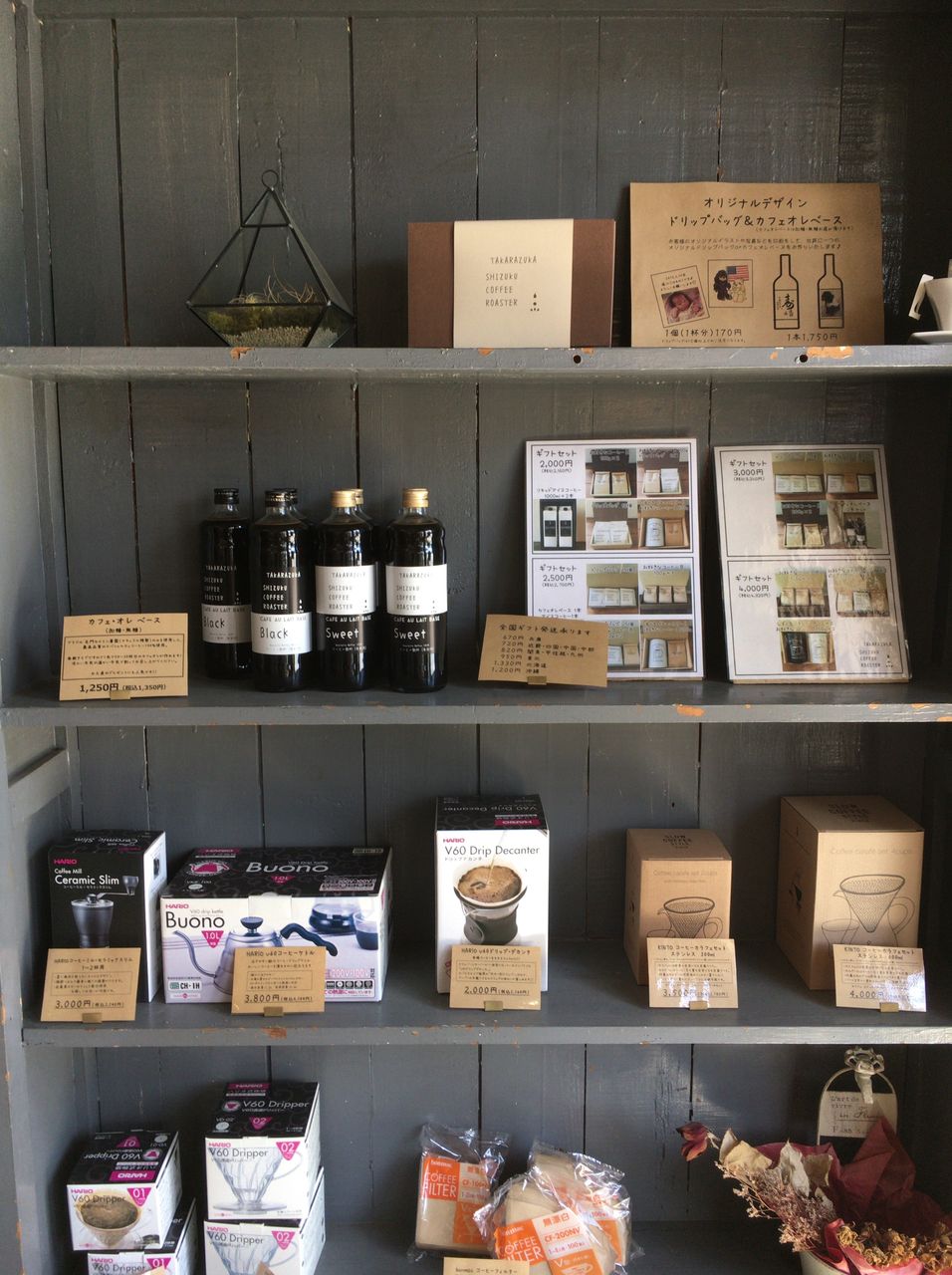 店内で販売されているカフェオレベース(加糖・無糖)やいろいろなコーヒー関連商品がある。