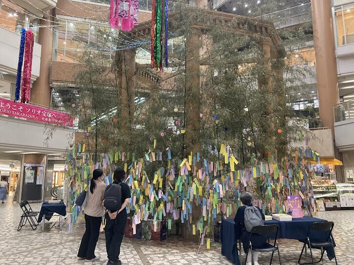 立ち止まって七夕飾りを眺める人、記念撮影をする人、願い事を書く人で賑わい、いつにもまして華やかなメインプラザでした。急ぎ足で阪急宝塚駅へと向かう宝塚歌劇の観劇後のお客さんたちも、ちらっと眺めながら歩いていきます。7月7日までなので、願い事を書きたい人はお早めに立ち寄ってみてくださいね。