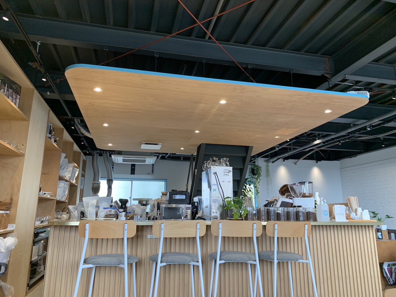 店内は明るく、木目調の家具と植物のグリーン、アクセントカラーのライトブルーが、心地の良く落ち着いた雰囲気です。