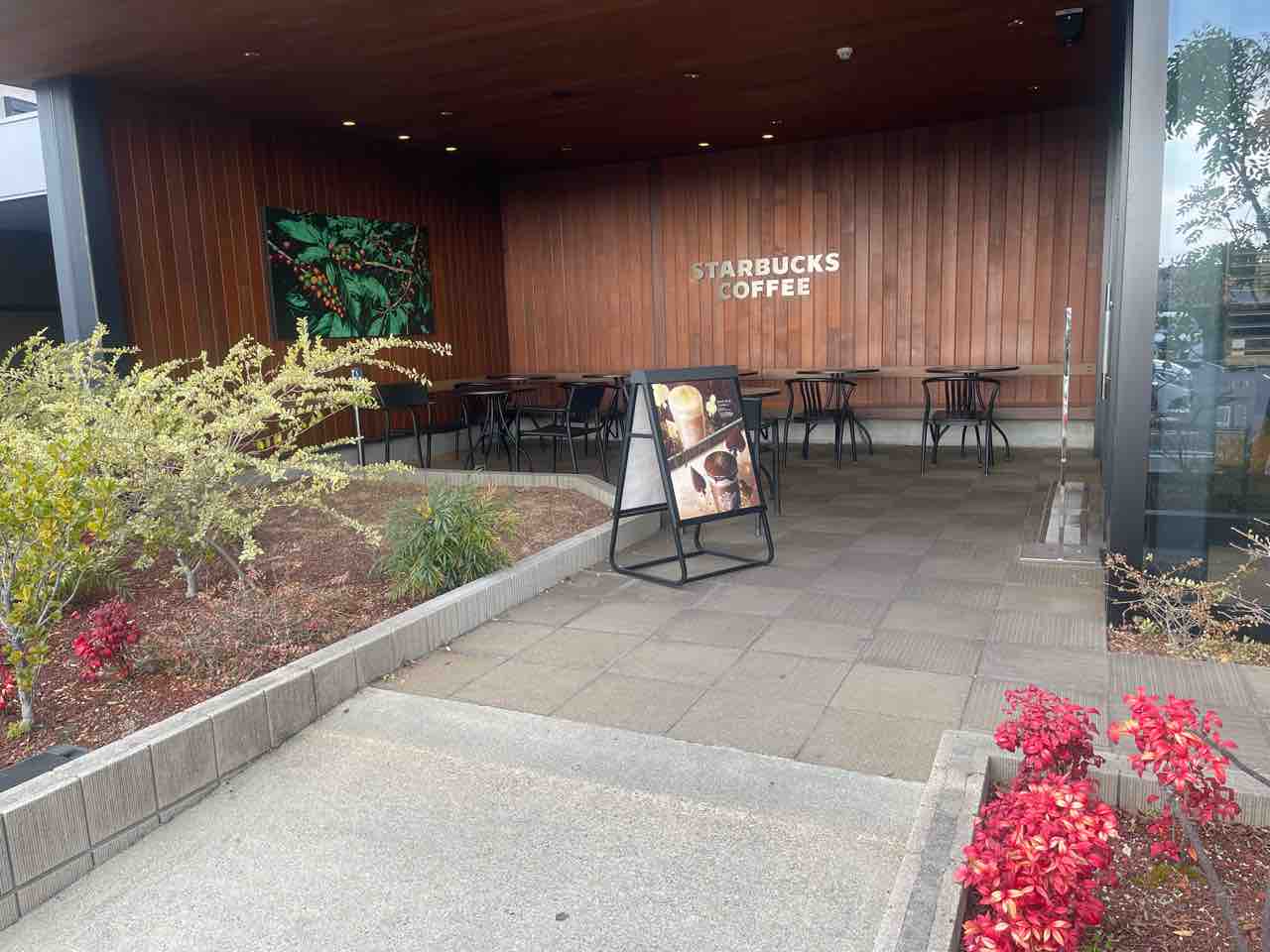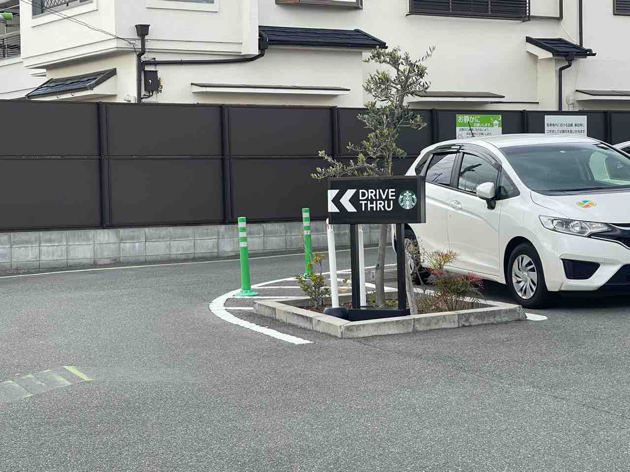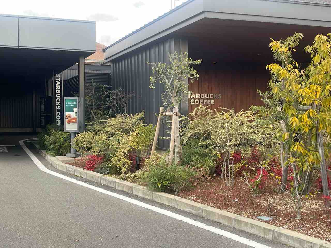 奥に見えるのが注文口。敷地内は美しく、建物も植栽もいい雰囲気で、ドライブスルー利用でもスタバのセンスの良さを感じることができます。