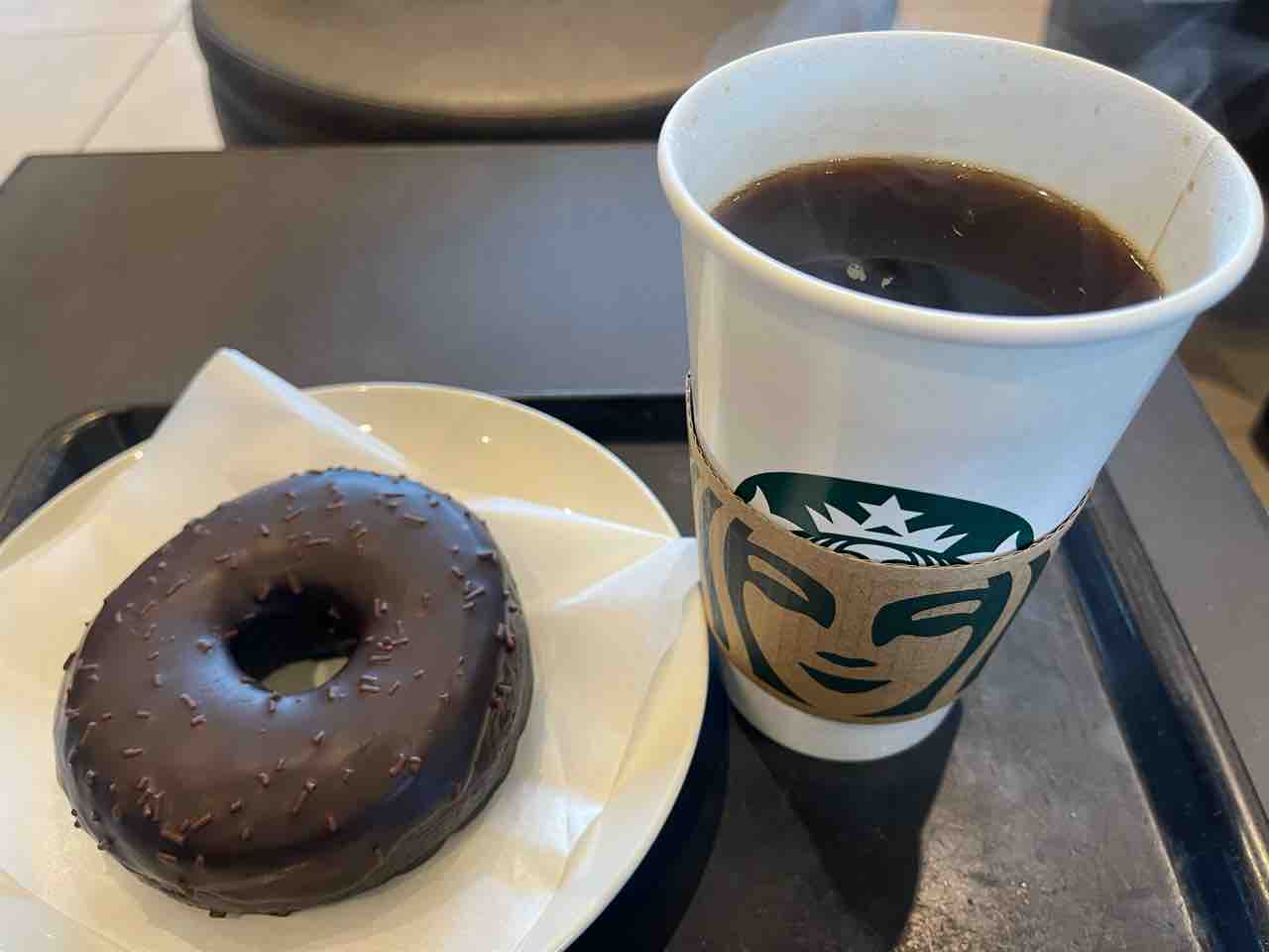 今日は仕事をこなしに来たので、多少の長居ができるようにグランデサイズのアメリカーノをチョイス、お供にはチョコレートクリームドーナツを。