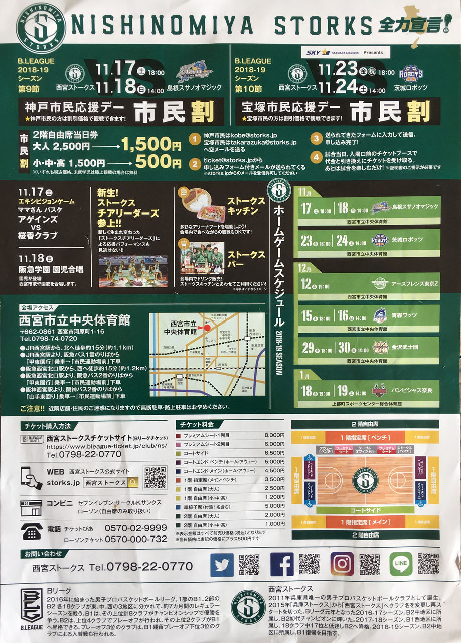 男子プロバスケットボールの『B.LEAGUE(Bリーグ)2018-19シーズン』で兵庫のチーム「西宮ストークス」がホームの西宮市立中央体育館で「茨城ロボッツ」と対戦(第10節)する。下記の2日間は、宝塚市民応援デーとして「市民割」が適応され、大人2500円→1500円、小・中・高1500円→500円 とお得に観戦できる2日間。