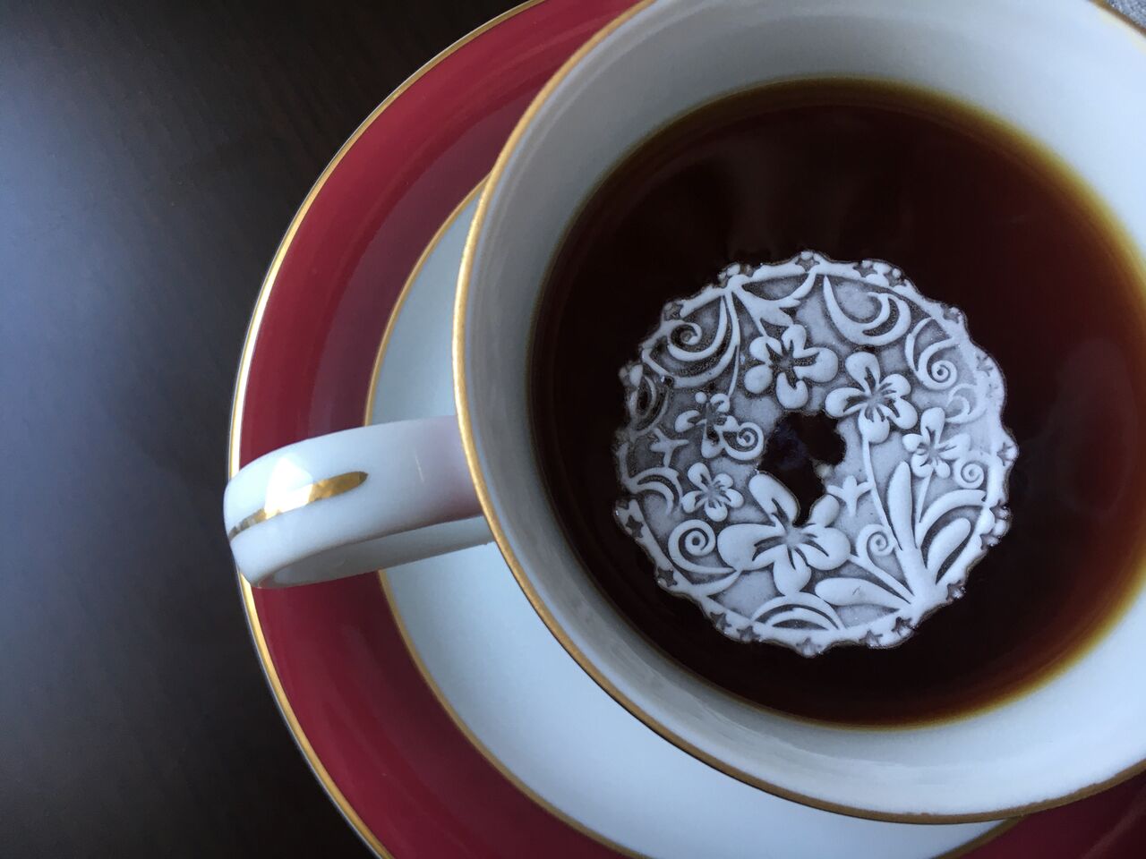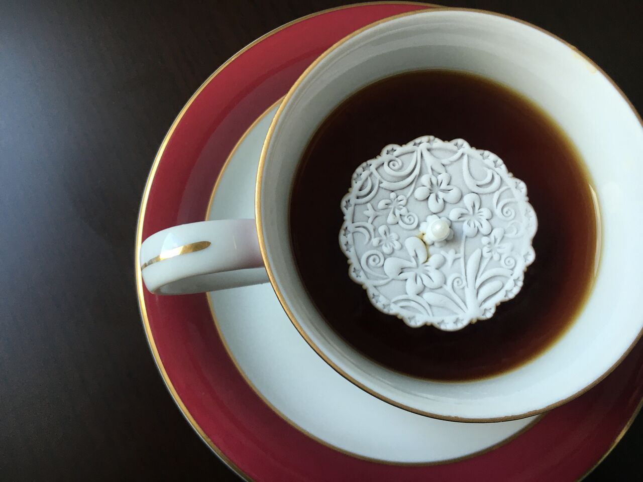 成功!すみれの花が描かれた美しいレースのようなお砂糖が、見事紅茶に浮かんでいます。なんとも優雅な気分!浮かべた後、じーっと見つめていると、ゆっくり5分ほどかけて少しずつ溶けていきました。