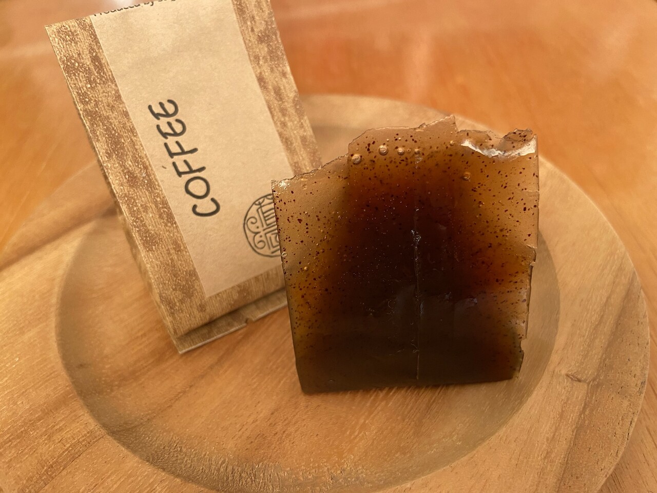 見た目は一般的な羊羹ですが、その中に挽いたコーヒー豆のような粒が散りばめられています。