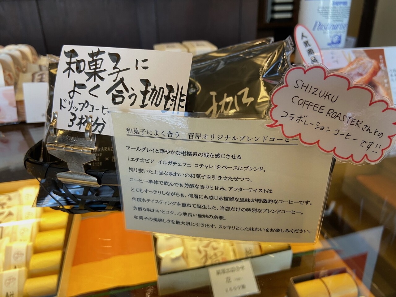 「和菓子によく合う珈琲 菅屋オリジナルブレンドコーヒー」と「珈琲羊羹」です。