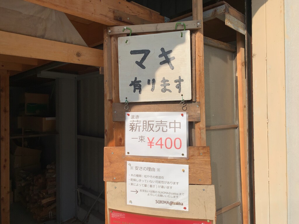 また、ここでは、薪が安く買うことできるということもあり、キャンパーの利用が多いそうだ。こちらが薪のコーナー。他店に比べると安い代わりに完全に乾燥しきっていないものあるので、そこを理解する事が前提だそうだ。
