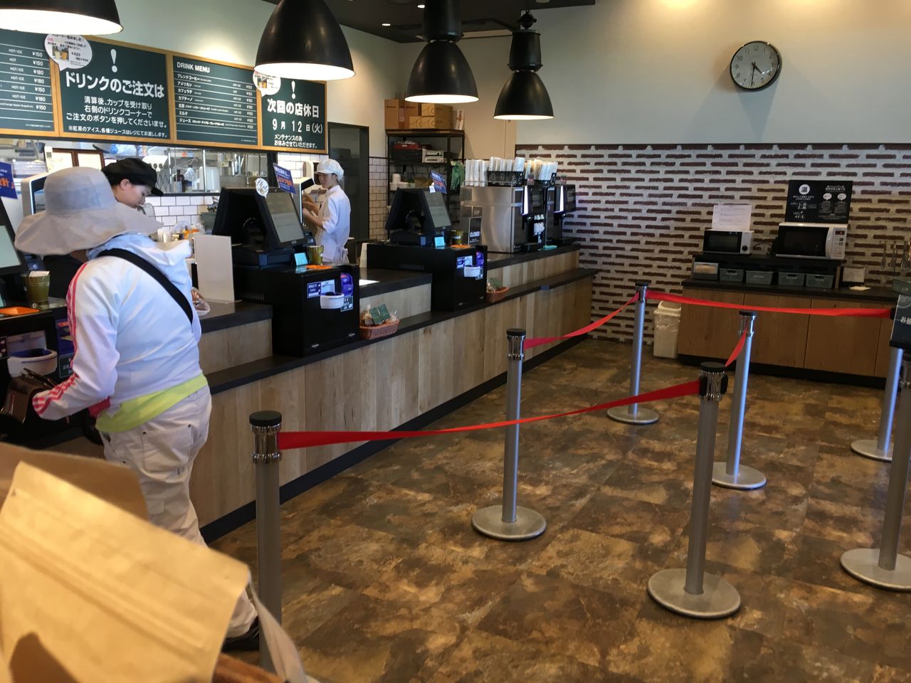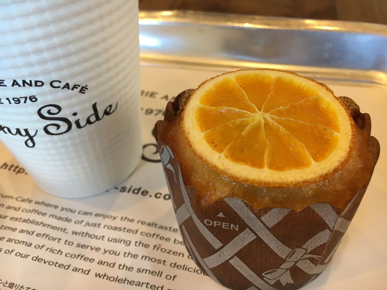 30席以上あるカフェコーナーでゆっくり座って頂きました。オレンジとチョコのマフィンは想像どおりのお味でした。ぶどう大福はふわふわの生地に白あんとホイップがたっぷり入って白あんのぶどうの相性に驚きがあります。珈琲はセルフでマシンから抽出するタイプです。150円でした。