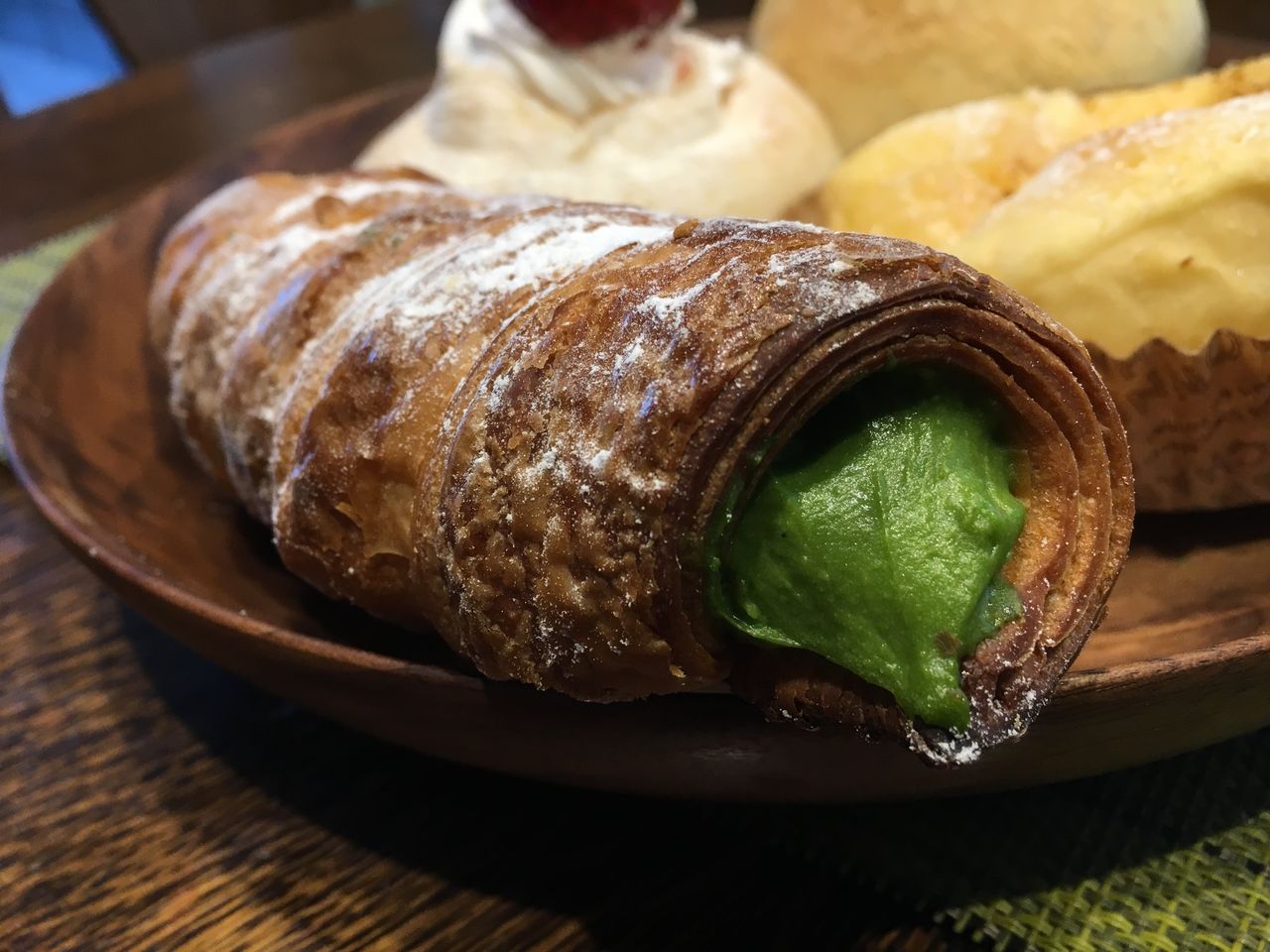 「濃厚な宇治抹茶クリームとホワイトチョコチップを混ぜたクリームを絞りました。」