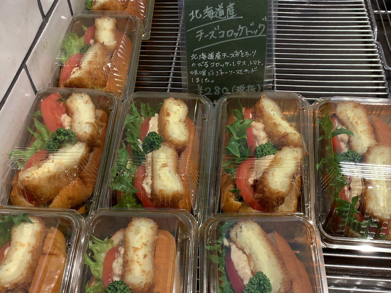「北海道産チーズがとろーりのびるコロッケ、レタス、トマト、味噌ジンジャーソースをサンドしました。¥280-」